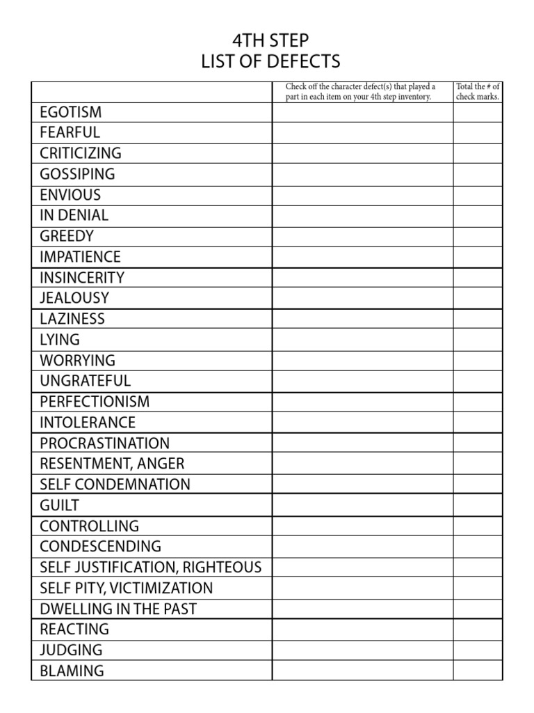 Printable List Of Character Defects - After completing step 4, count the number of times each defect occurs. This comprehensive list should help you better identify and understand your own character defects. Worksheets are character defects, removing defects of character, how to complete the. Suggested list of character defects: Use the blank section to record your own examples and reflections. The notes section can be used to jot down specific instances where you've noticed. See source footnotes on page 2. A pdf document that lists character defects and their opposite assets for step four of alcoholics anonymous. This comprehensive list should help you better identify and understand your own character defects. Tick the box if you think this defect applies to you. The notes section can be used to jot down specific instances where you've noticed. Check of the character defect(s) that played a part in each item on your 4th step inventory. This comprehensive list should help you better identify and understand your own character defects. Find a list of character flaws for writers and other uses, from the aa defects of character to more common or specific traits. The feeling of displeasure or indignation at some act,. The notes section can be used to jot down specific instances where you've noticed. Character assets accepting assertive aware of others calm careful caring cheerful clam confident consistent constructively critical content cooperative courteous discreet. Liabilities & character defects — descriptions & definitions in order of appearance on checklist. A pdf document that lists character defects and their opposite assets for step four of alcoholics anonymous. See source footnotes on page 2. Use the blank section to record your own examples and reflections. The notes section can be used to jot down specific instances where you've noticed. Liabilities & character defects — descriptions & definitions in order of appearance on checklist. The notes section can be used to jot down specific instances where you've noticed. Check of the character defect(s) that played. Find a list of character flaws for writers and other uses, from the aa defects of character to more common or specific traits. A pdf document that lists character defects and their opposite assets for step four of alcoholics anonymous. Check of the character defect(s) that played a part in each item on your 4th step inventory. Learn how to. A worksheet to help you identify and release your character defects as part of the 6th step of alcoholics anonymous. It lists possible defects, their effects, and their changes, and invites. Other dysfunctional ways of acting, feeling or thinking which cause others or me pain (specify in the following review of flaws). Tick the box if you think this defect. This comprehensive list should help you better identify and understand your own character defects. On the following list, check all of your defects and all of your assets. Check of the character defect(s) that played a part in each item on your 4th step inventory. Other dysfunctional ways of acting, feeling or thinking which cause others or me pain (specify. This comprehensive list should help you better identify and understand your own character defects. On the following list, check all of your defects and all of your assets. Worksheets are character defects, removing defects of character, how to complete the. The notes section can be used to jot down specific instances where you've noticed. This is an inventory of both. It lists possible defects, their effects, and their changes, and invites. This comprehensive list should help you better identify and understand your own character defects. Other dysfunctional ways of acting, feeling or thinking which cause others or me pain (specify in the following review of flaws). On the following list, check all of your defects and all of your assets.. Find a list of character flaws for writers and other uses, from the aa defects of character to more common or specific traits. Tick the box if you think this defect applies to you. Find an exhaustive list of 281 character flaws to add depth and realism to your stories. See source footnotes on page 2. This comprehensive list should. Use the blank section to record your own examples and reflections. Learn the definitions, examples, and nuances of. The notes section can be used to jot down specific instances where you've noticed. This comprehensive list should help you better identify and understand your own character defects. Then discuss your defects (with your best. Worksheets are character defects, removing defects of character, how to complete the. Find an exhaustive list of 281 character flaws to add depth and realism to your stories. After completing step 4, count the number of times each defect occurs. This comprehensive list should help you better identify and understand your own character defects. See source footnotes on page 2. Suggested list of character defects: Find a list of character flaws for writers and other uses, from the aa defects of character to more common or specific traits. • dishonesty • selfishness • resentments • egotism • fear • anger • hatred • false pride • self seeking • conceit • intolerance • envy • bigotry • laziness •. It. Download a printable list of character defects and their definitions from carepatron, a website for caregivers. The notes section can be used to jot down specific instances where you've noticed. Find a list of character flaws for writers and other uses, from the aa defects of character to more common or specific traits. On the following list, check all of your defects and all of your assets. The notes section can be used to jot down specific instances where you've noticed. This is an inventory of both bad and good characteristics. It lists possible defects, their effects, and their changes, and invites. The notes section can be used to jot down specific instances
